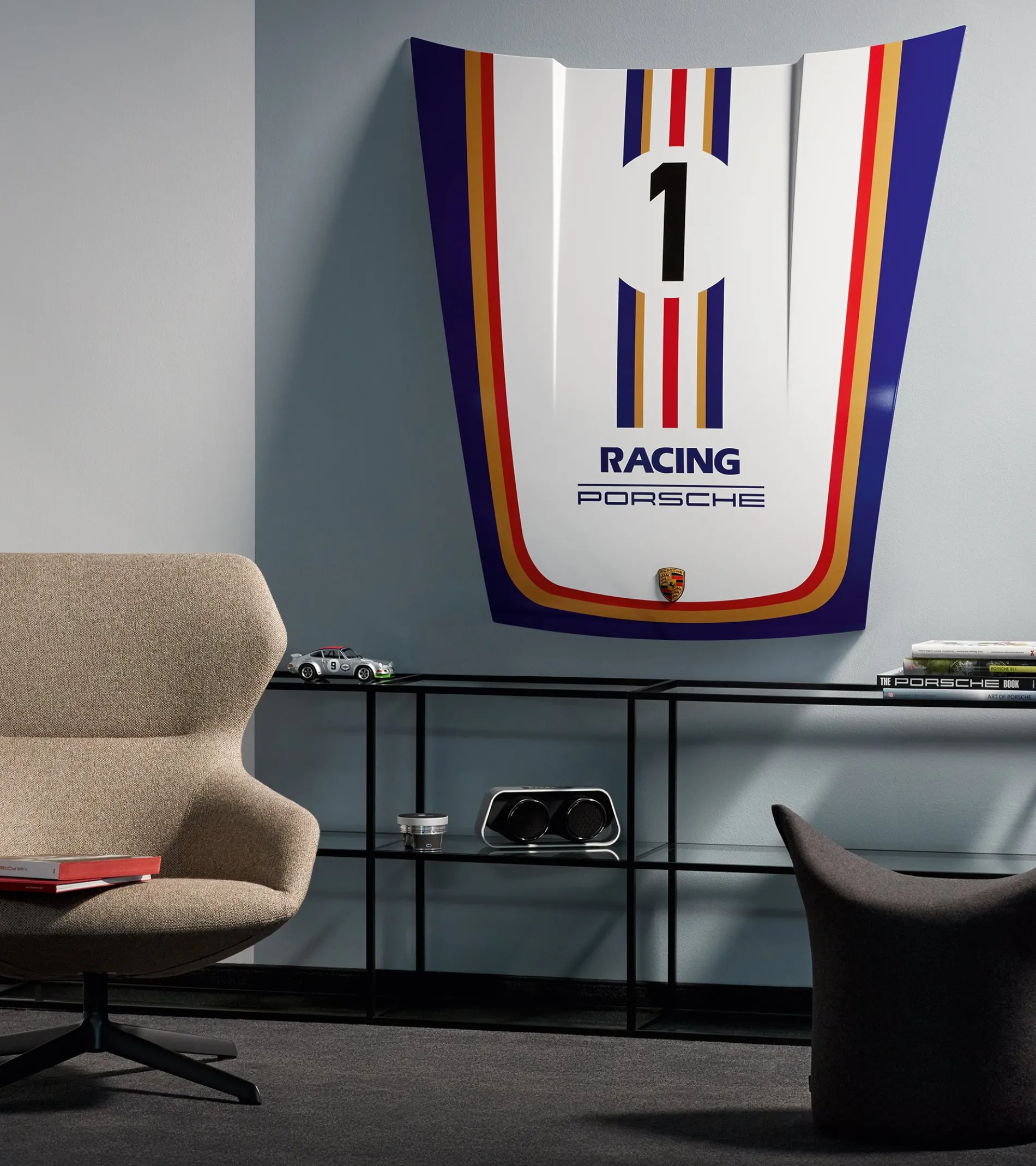 A Piece Of Porsche History – For Your Home. The Original Front Hood Of The Historic Porsche 911 (G-Model) In White With A Foil Decal In Popular Motorsport Finishes, As Well As An Original Historic Porsche Crest, Is Not Just An Impressive Decoration, But Also A Stylish Magnetic Wall.
